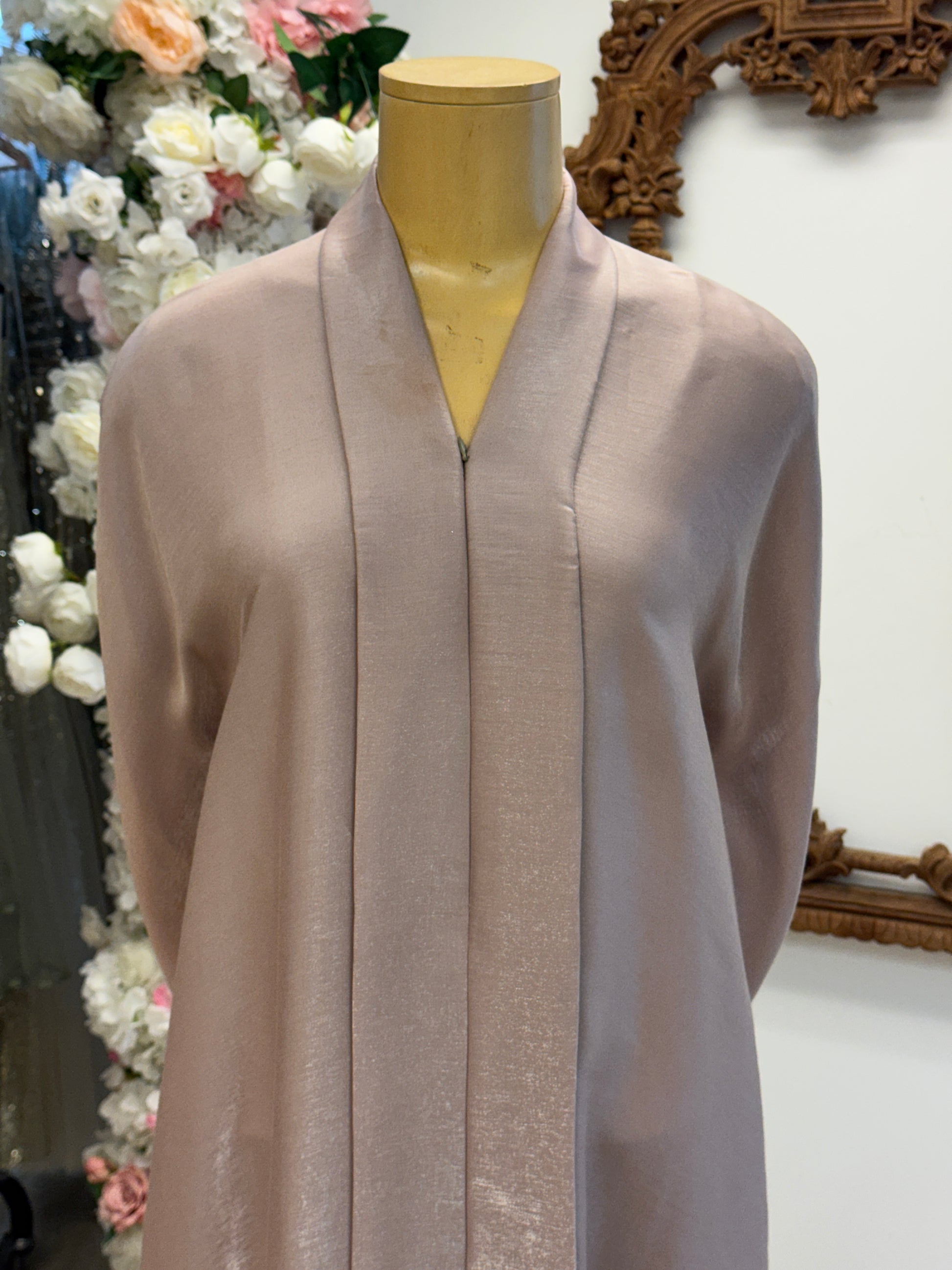 A luminous silhouette in soft blush satin. This abaya features a high neckline and long sleeves, with a fluid drape that catches the light beautifully. Its minimalist elegance and luxurious texture make it ideal for bridal styling, formal events, or elevated modest dressing.