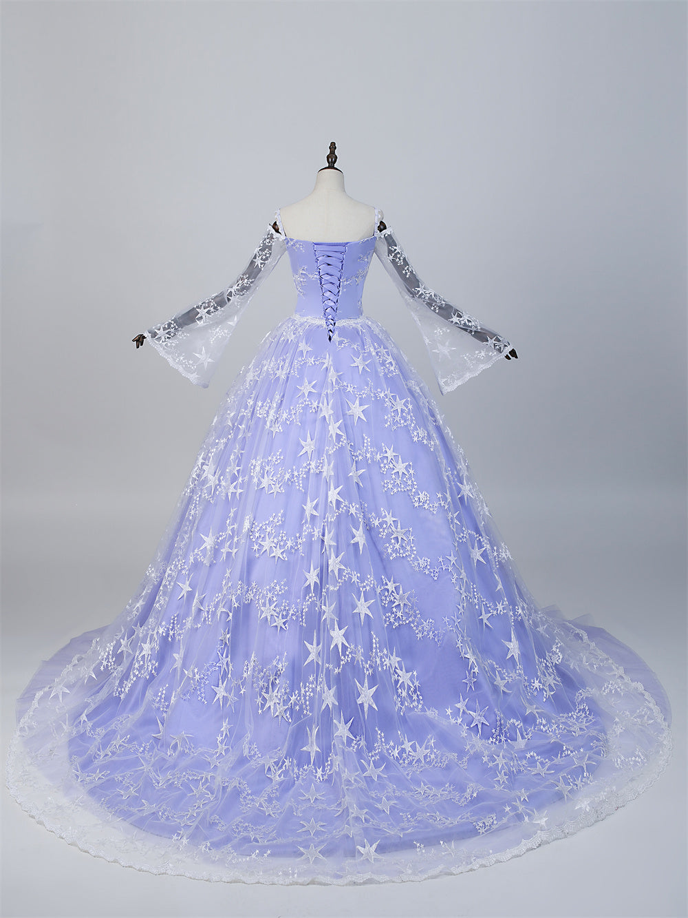 A couture bridal gown inspired by starlit skies and ethereal grace. This lavender silhouette features a sweetheart neckline, sheer bell sleeves adorned with lace and star embroidery, and a voluminous skirt layered in celestial motifs. A piece for the bride who dreams in constellations and walks in quiet wonder.