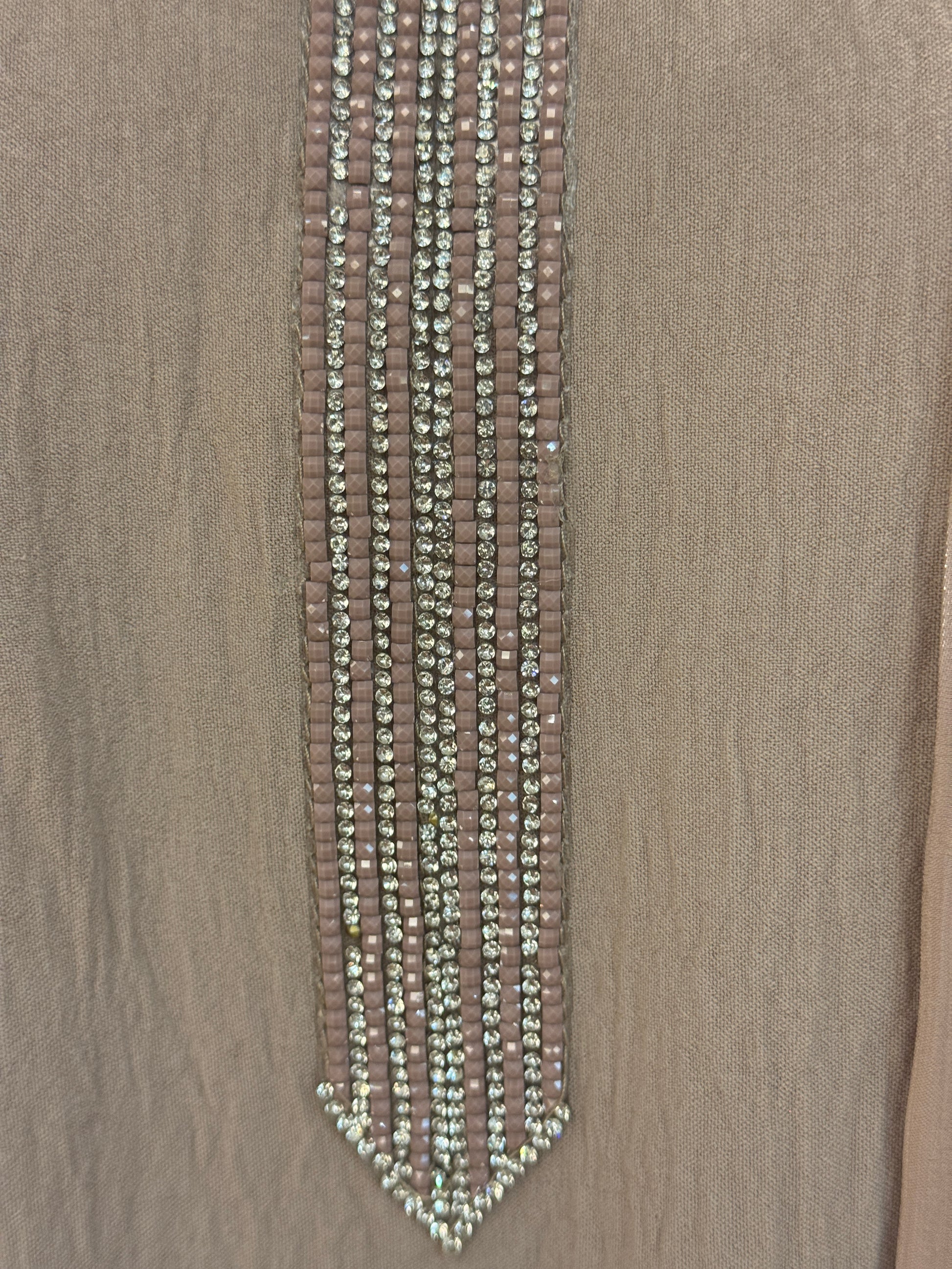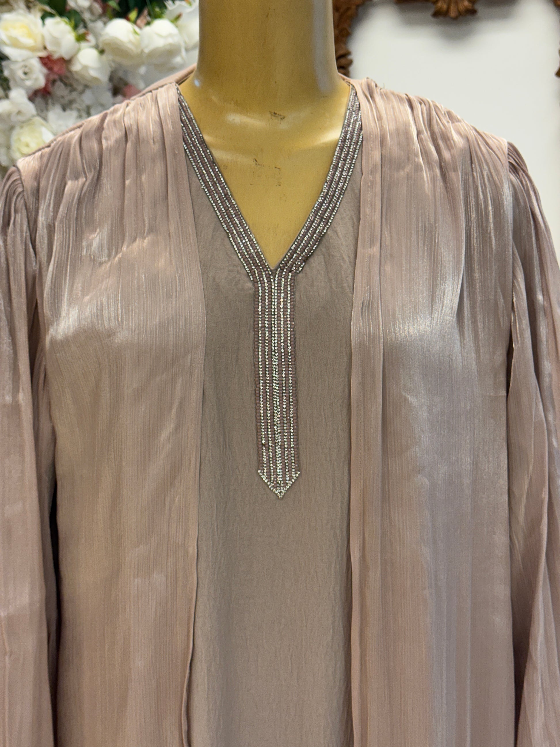 A soft, radiant silhouette that exudes quiet luxury. This champagne-toned abaya features a shimmering beaded neckline in a pointed drop shape, complemented by long, flowing sleeves and a silky finish. Its understated elegance makes it perfect for bridal events, festive gatherings, or elevated everyday wear.