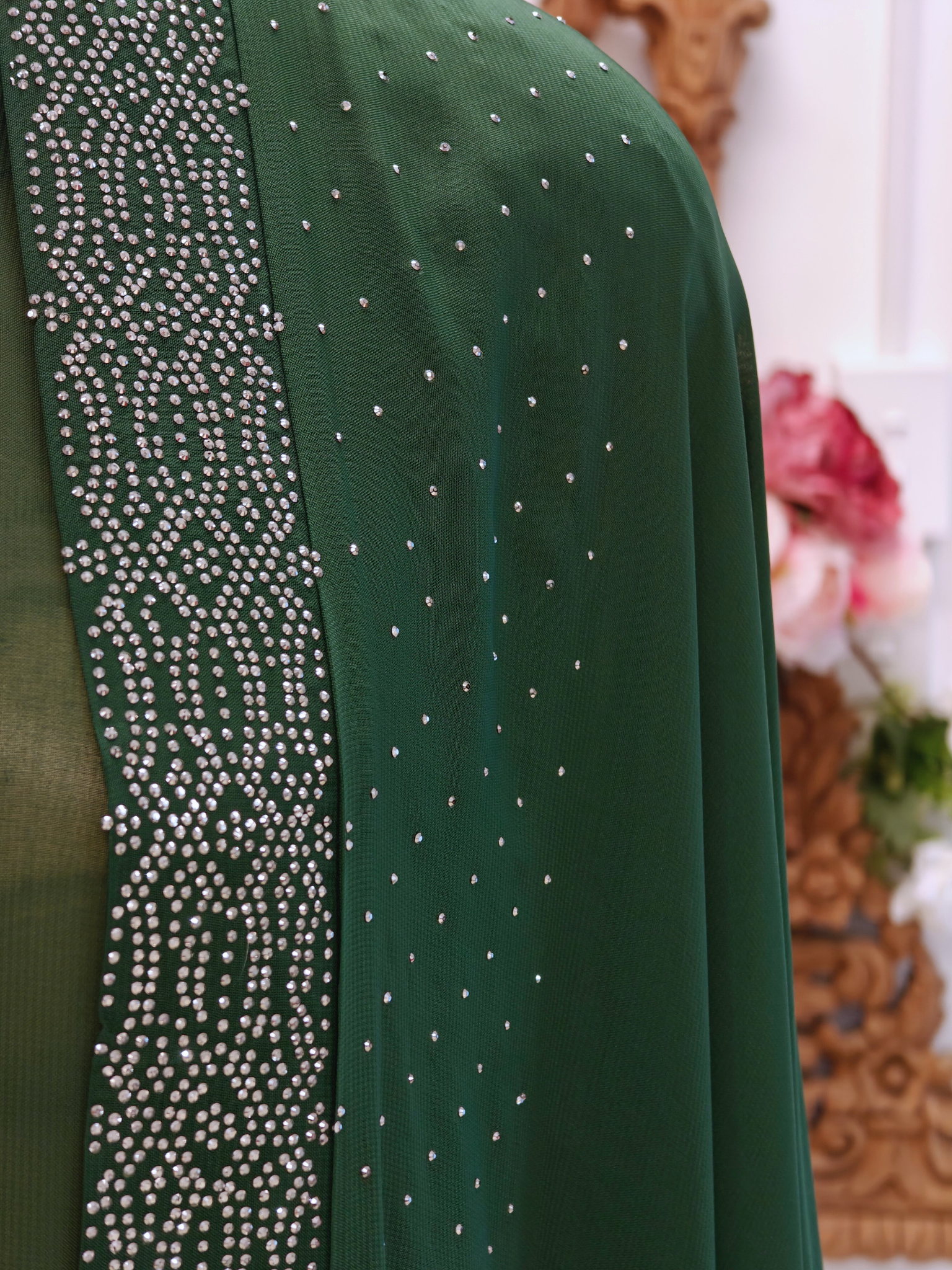 A timeless silhouette meets artisanal detail. This deep green abaya is adorned with delicate silver embroidery and scattered embellishments that shimmer softly with movement. Designed for modest elegance, it offers full coverage with a fluid drape—perfect for festive evenings, cultural gatherings, or elevated everyday wear.