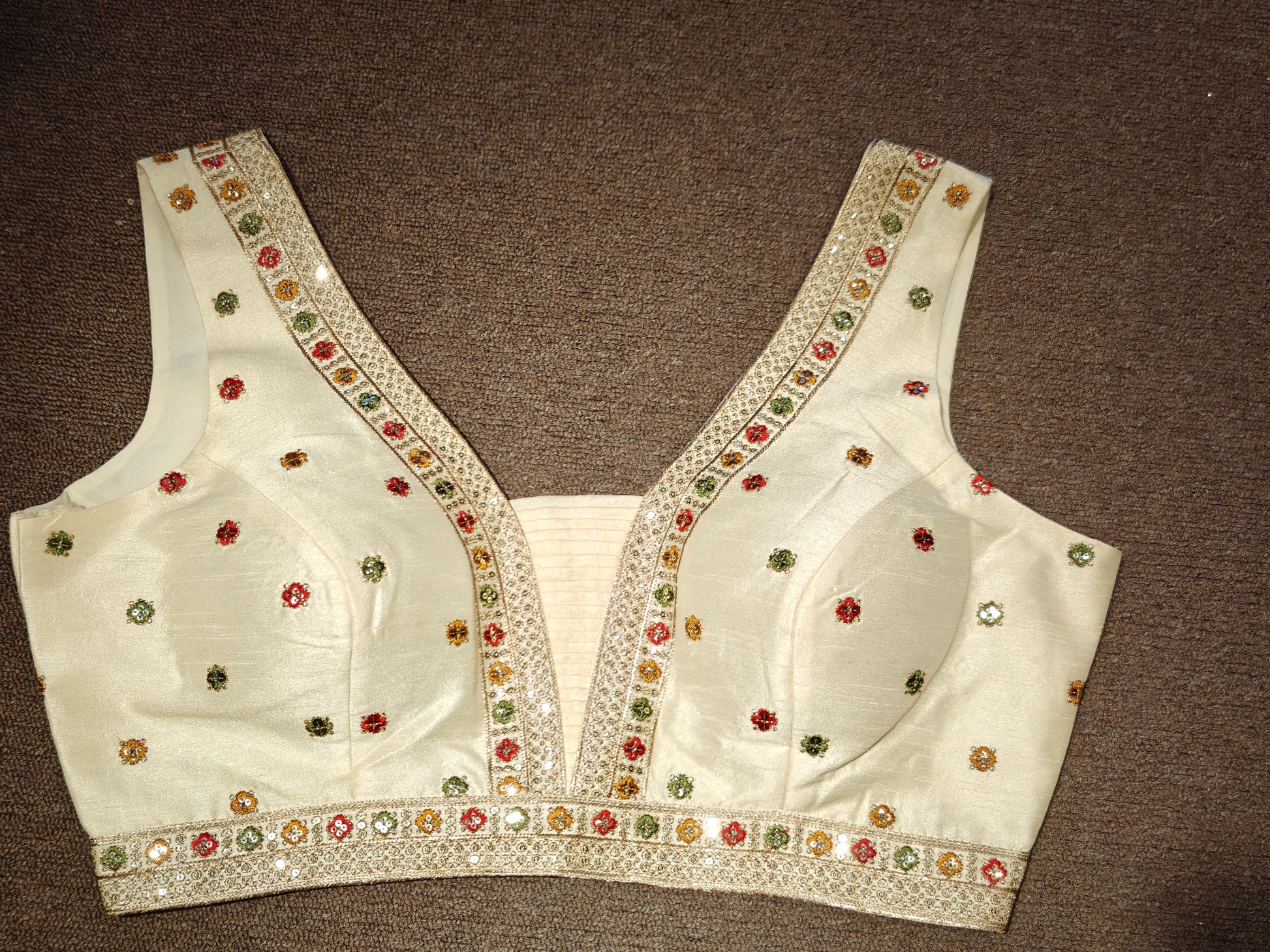 A timeless piece of heritage elegance. This cream-colored choli features delicate floral embroidery in red, green, and gold, with sequined borders that add a gentle shimmer. Perfect for pairing with lehengas or silk saris, it’s a celebration of craftsmanship and tradition.