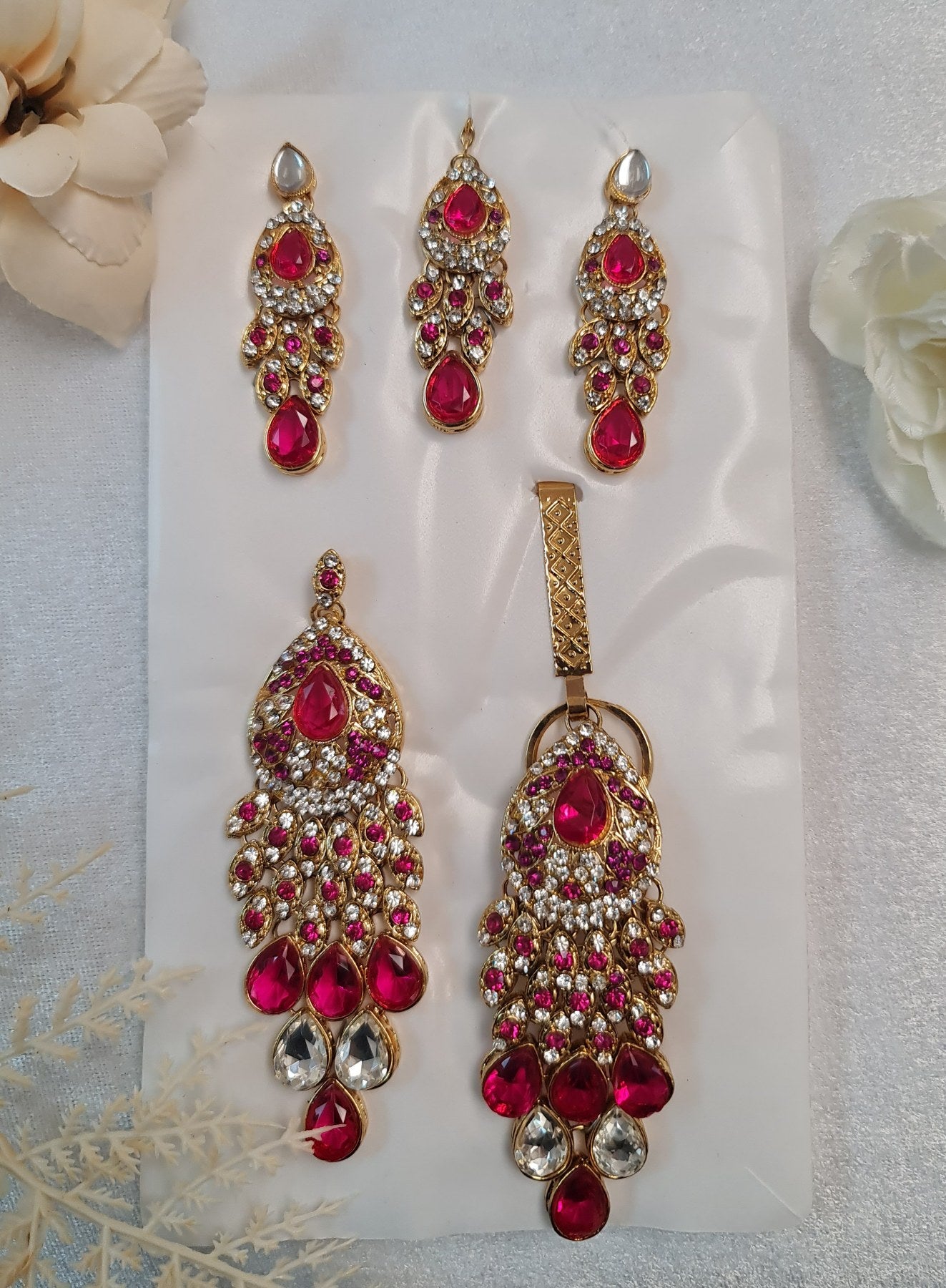 5 piece jewellery set-Rani Pink and silver with golden base.