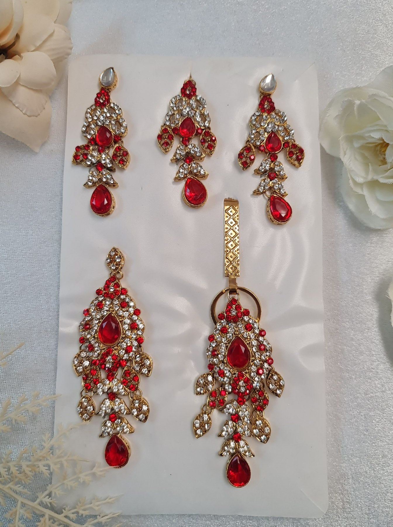 5 piece jewellery set- Red and silver with golden base.