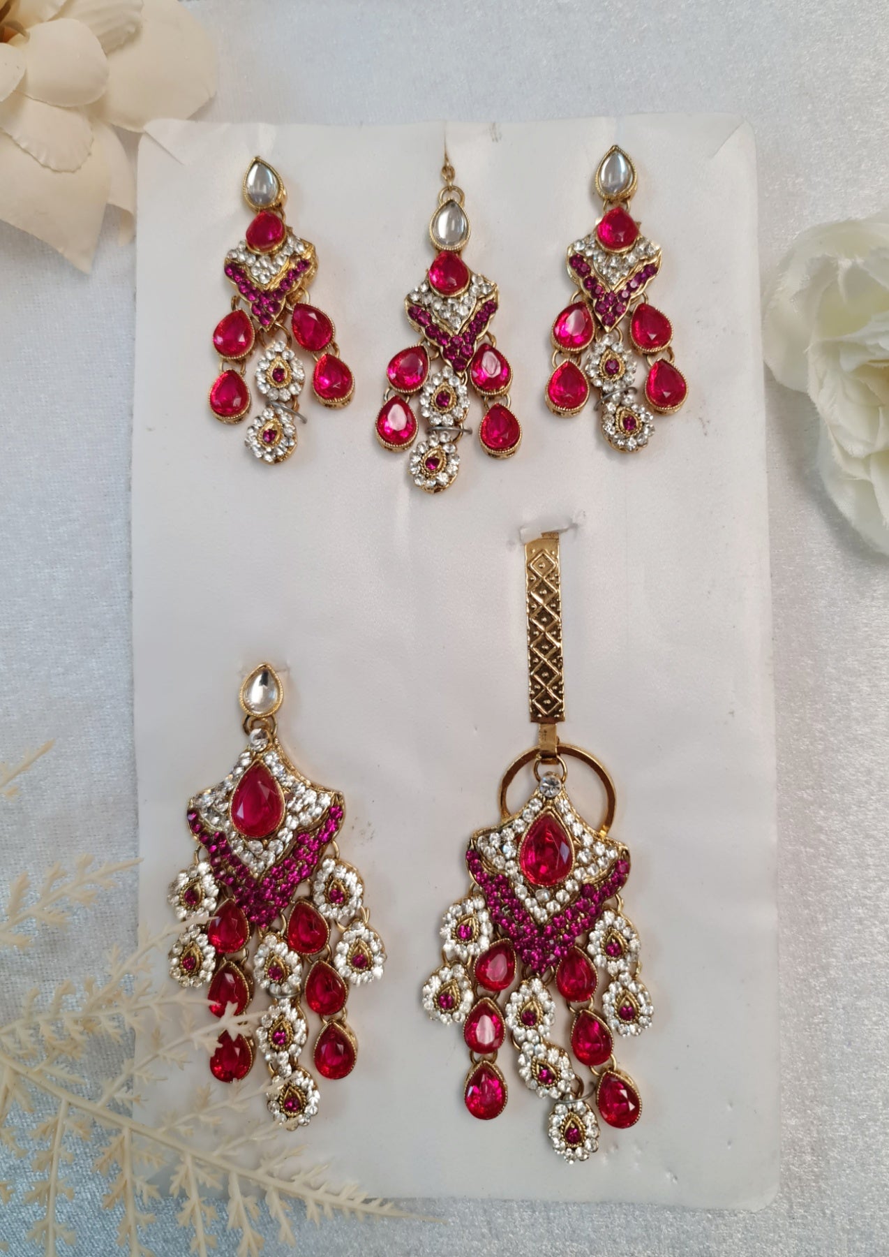 5 piece jewellery set- Rani Pink and silver with golden base.