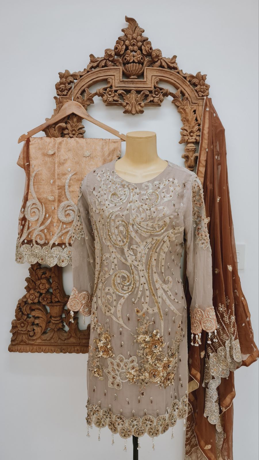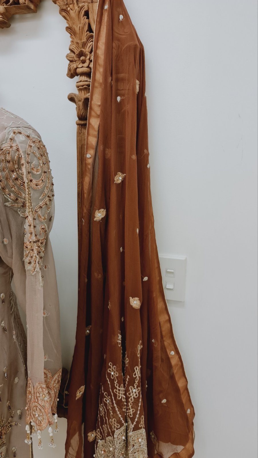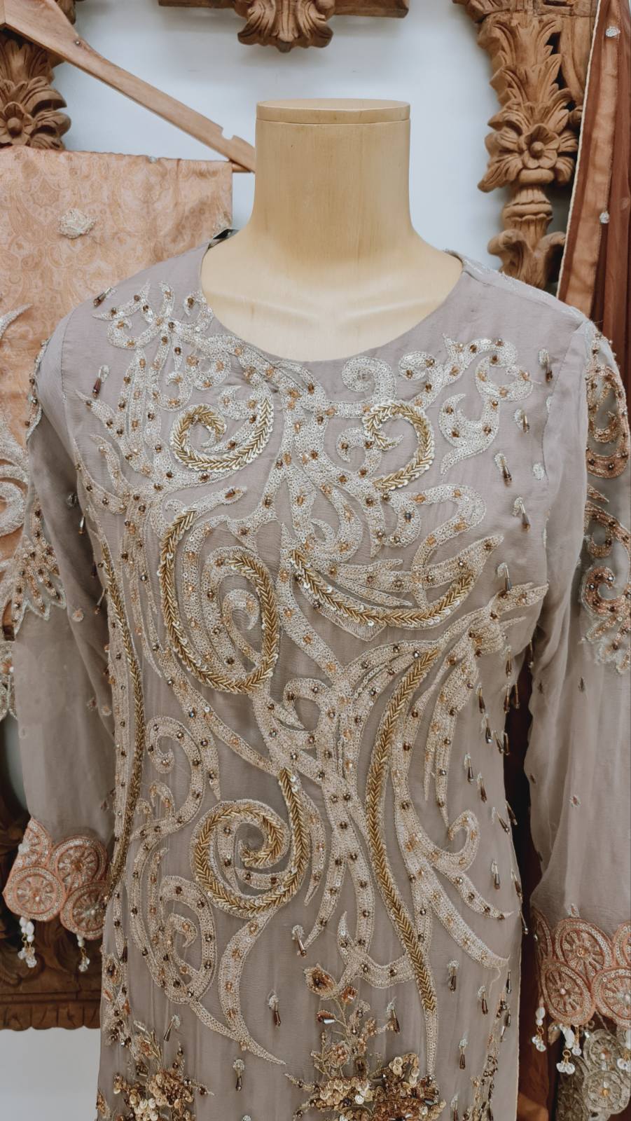 Grey and brown heavy beaded Pakistani kameez with matching wide-legged bronze pants and brown dupatta - size 44 to 48