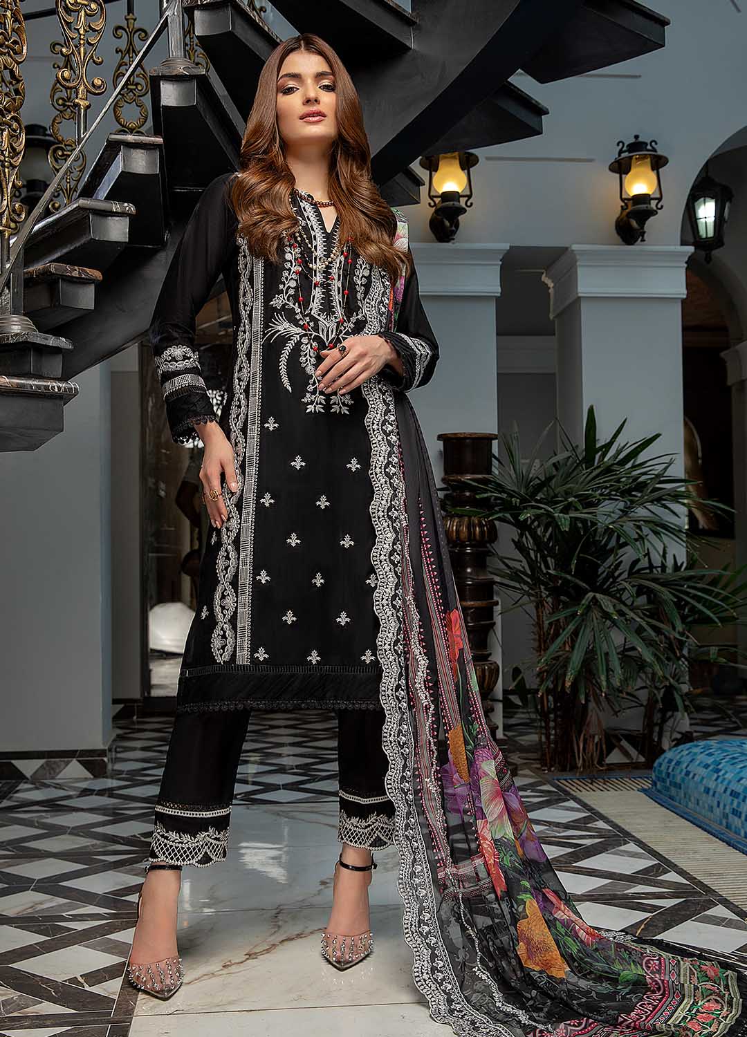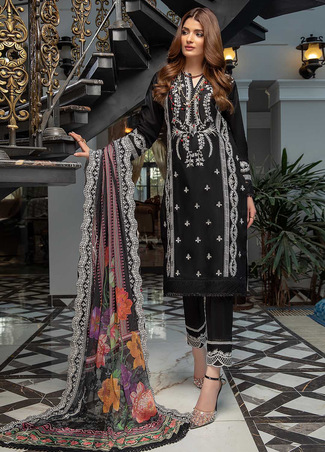 Embroidered kameez with soft floral chiffon dupatta.
