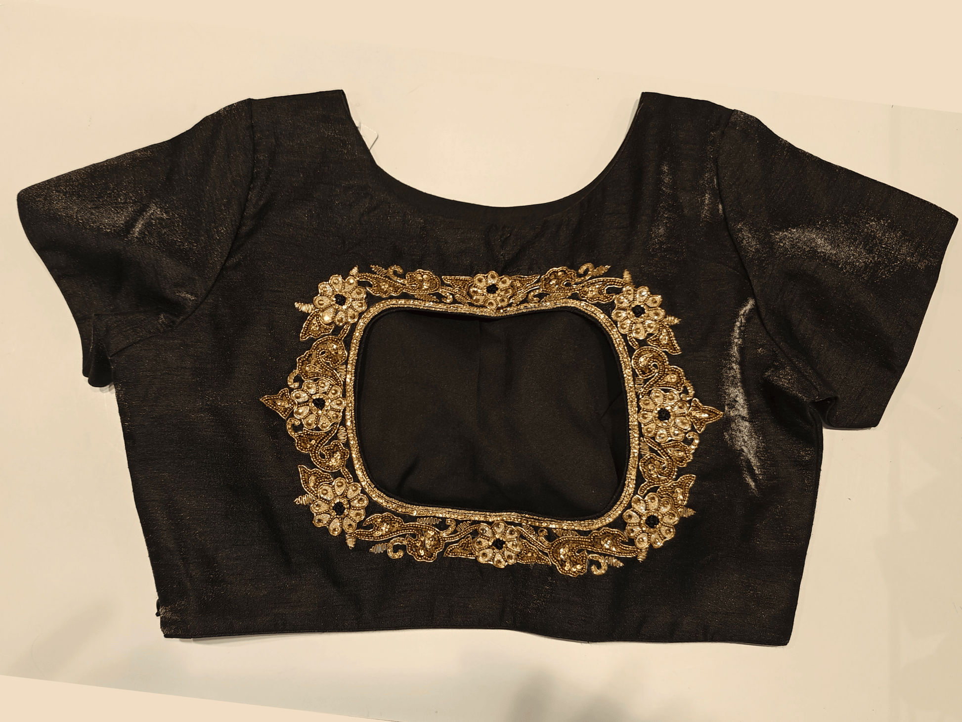 Classic with a hint of drama, this black blouse is elevated by intricate gold floral embroidery and shimmering beadwork across the shoulder. The short-sleeve silhouette and rich detailing make it a versatile piece for festive styling, evening wear, or fusion edits. A subtle sparkle adds just the right amount of glamour.