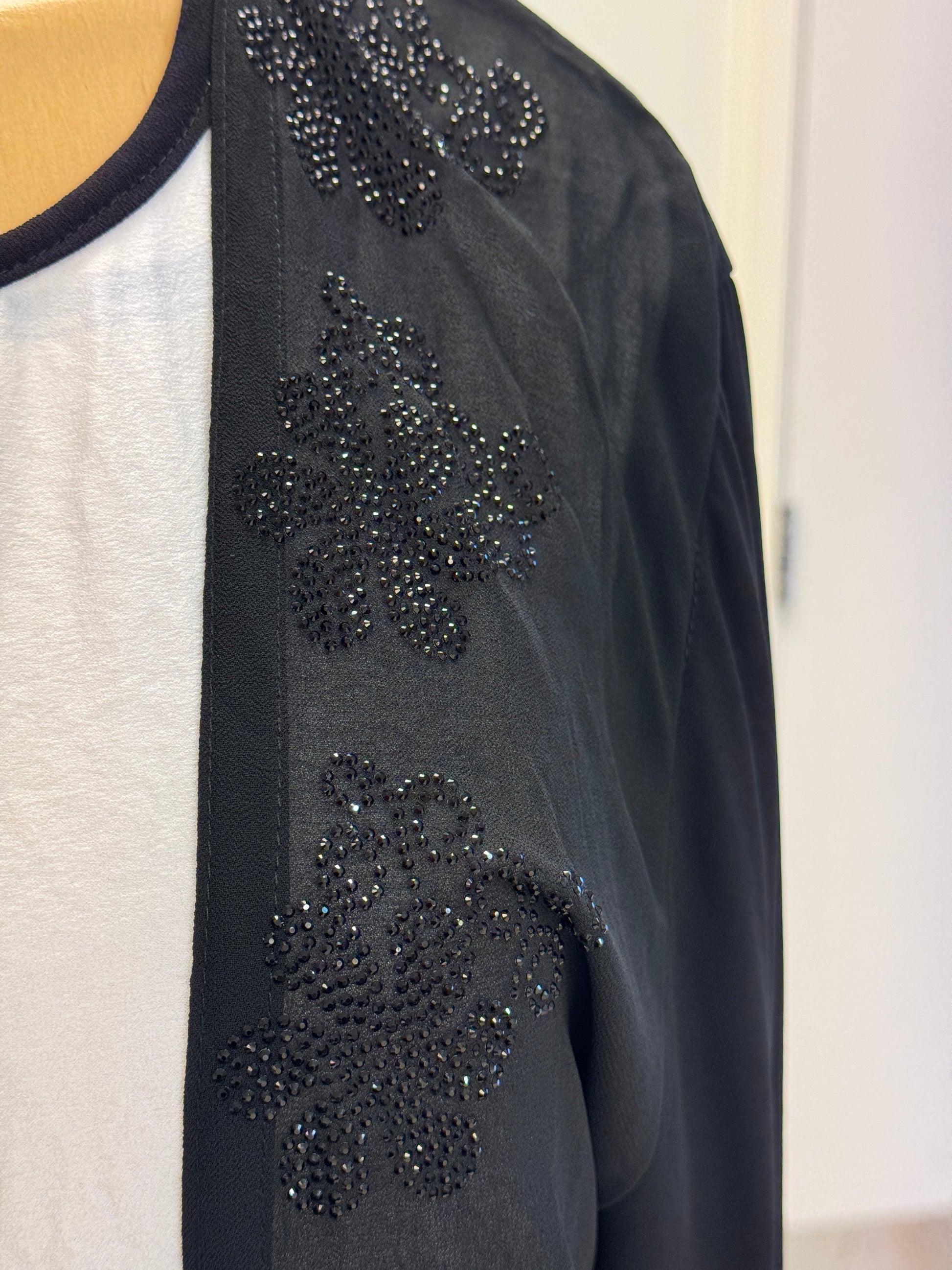 A timeless silhouette with bold contrast and delicate detail. This black abaya features subtle floral embroidery and a striking white central panel that elongates the form. Its clean lines and elegant flow make it ideal for formal occasions or elevated everyday wear.