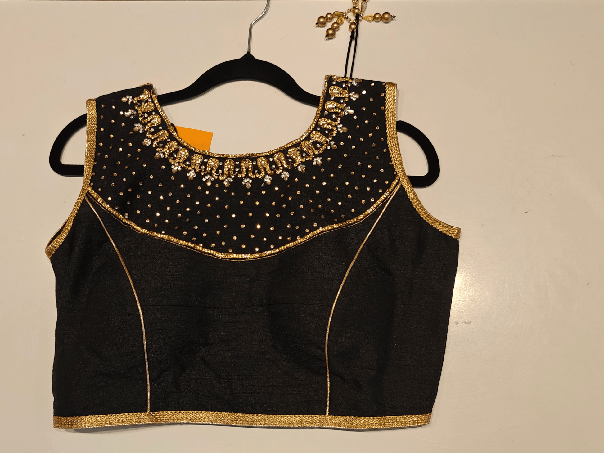 Timeless and opulent, this black choli is adorned with intricate gold embellishments that shimmer with every movement. The neckline features ornate beadwork and sequins in a regal pattern, while dotted gold motifs and piping along the seams add structure and elegance. Perfect for bridal styling, festive edits, or evening glamour.
