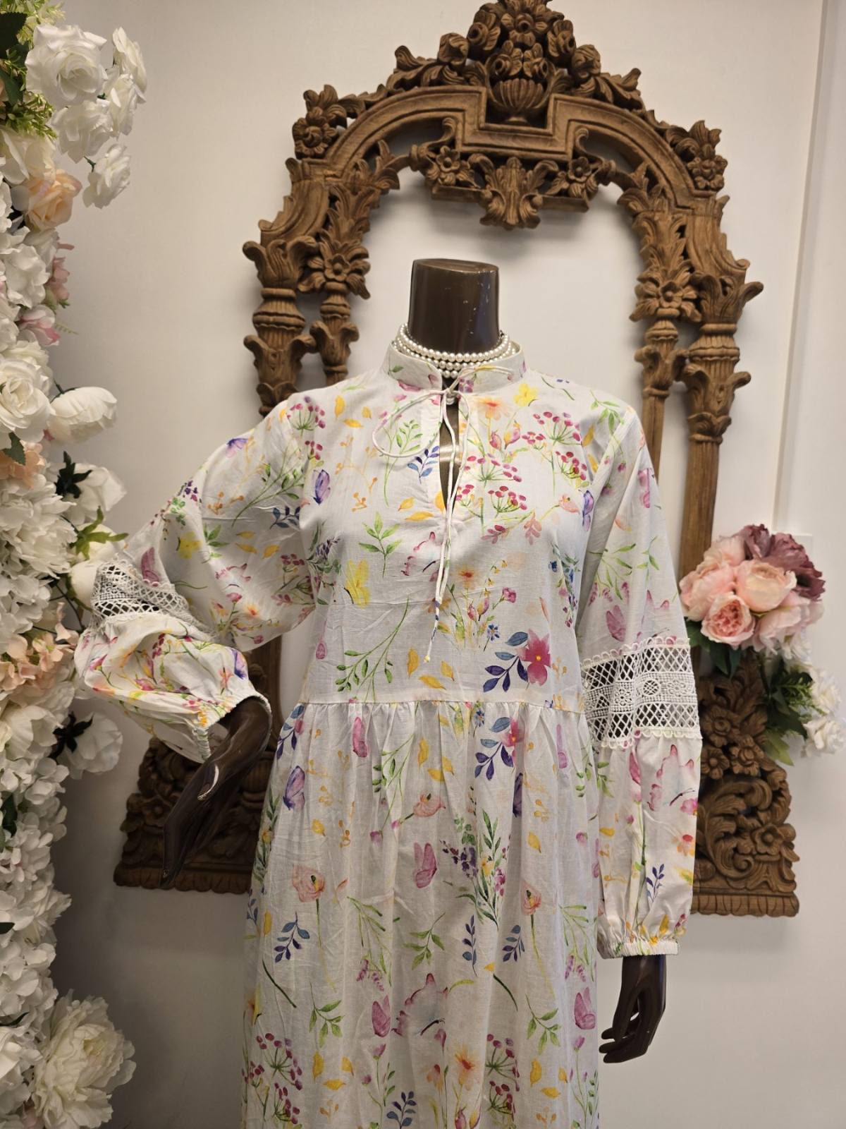 Crafted from breathable 100% cotton, this gown features a soft ivory base adorned with a vibrant floral print in pink, purple, yellow, and green. The high neckline ties delicately at the collar, while long sleeves with lace inserts and a tiered skirt with lace trim evoke timeless elegance. A pearl necklace adds a graceful accent to the look, and the fully lined construction ensures comfort from day to night.