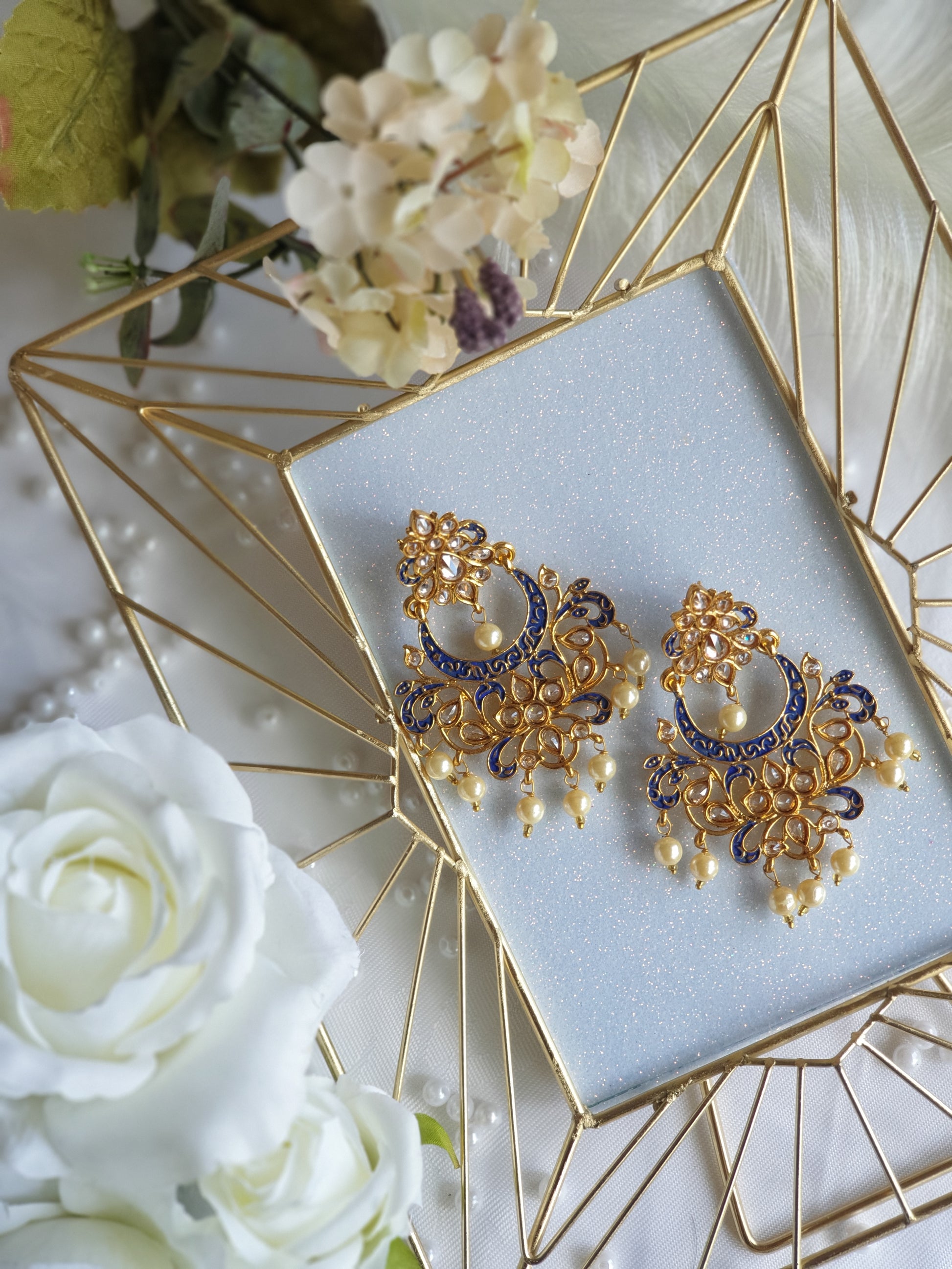 Royal blue painted Kundan earrings. Gorgeous staple piece. Available in light peach, red, and grey.