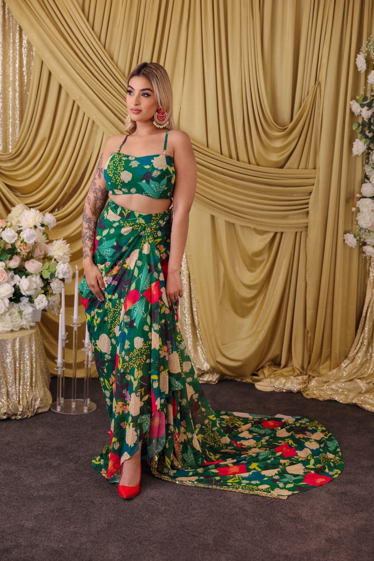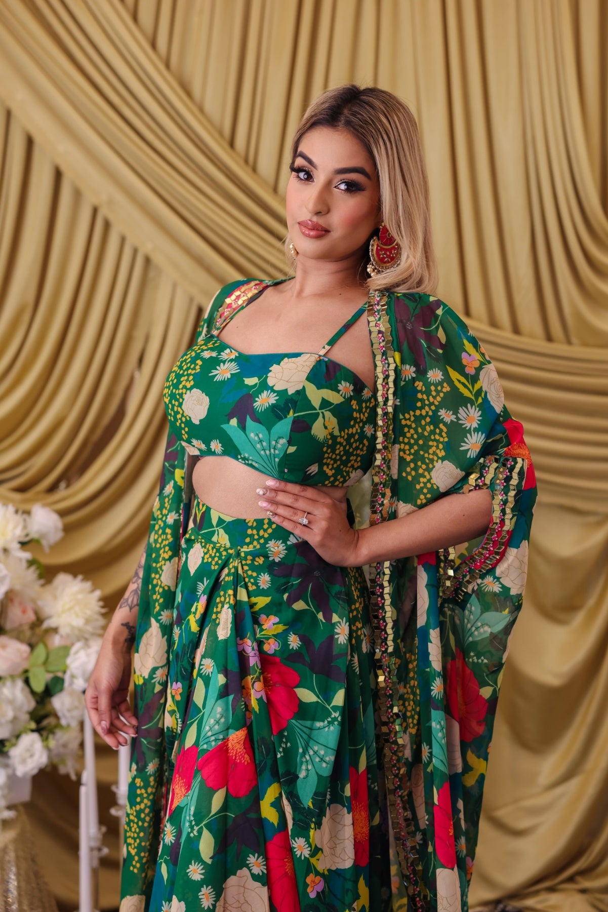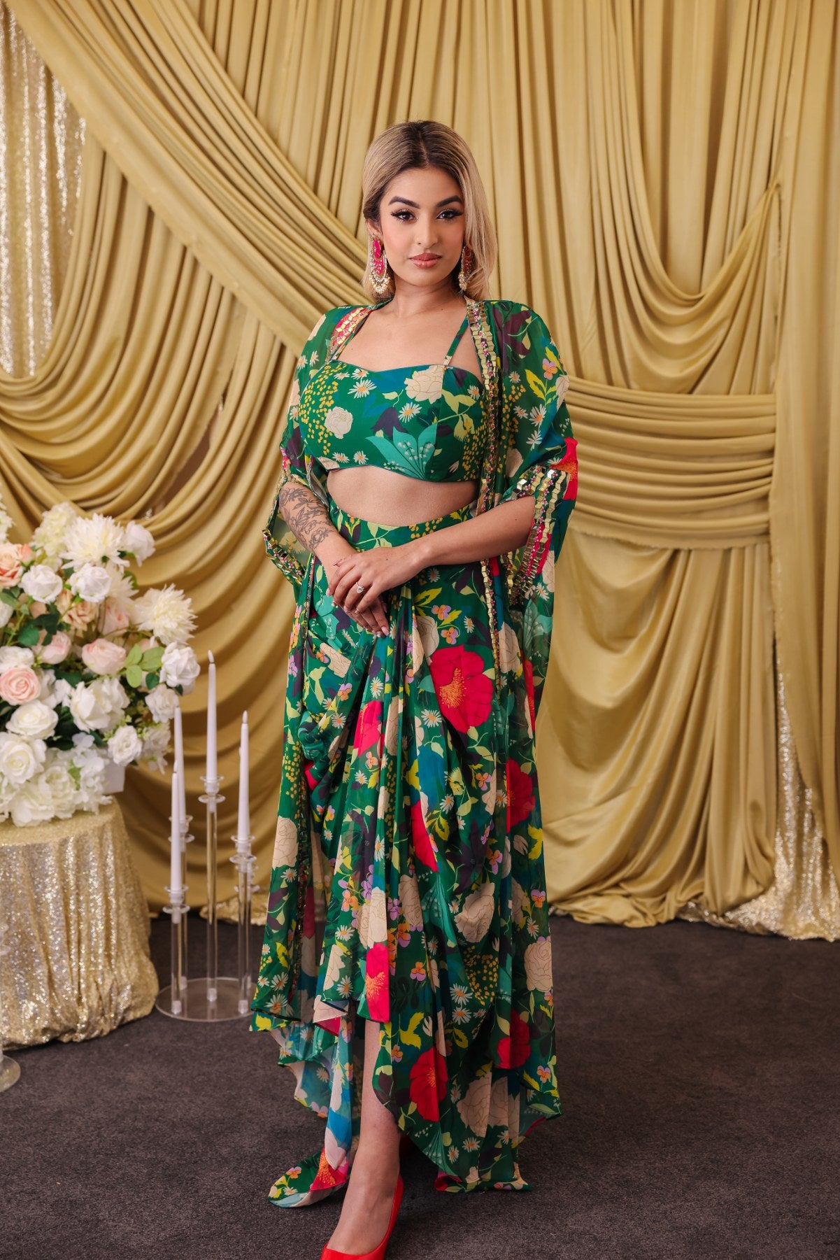 This emerald green 3 piece comes with a draped skirt, crop top style blouse and floor length jacket and is perfect to wear for resort functions, beach weddings, or as a funky mehndi night outfit.