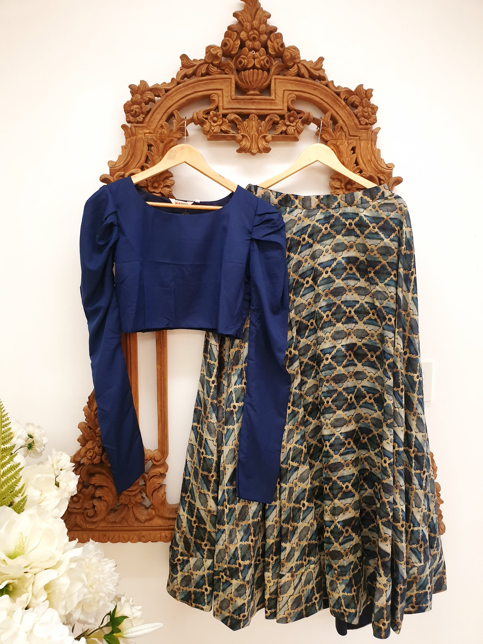 Silk skirt paired with a long sleeved navy silk ruffle blouse