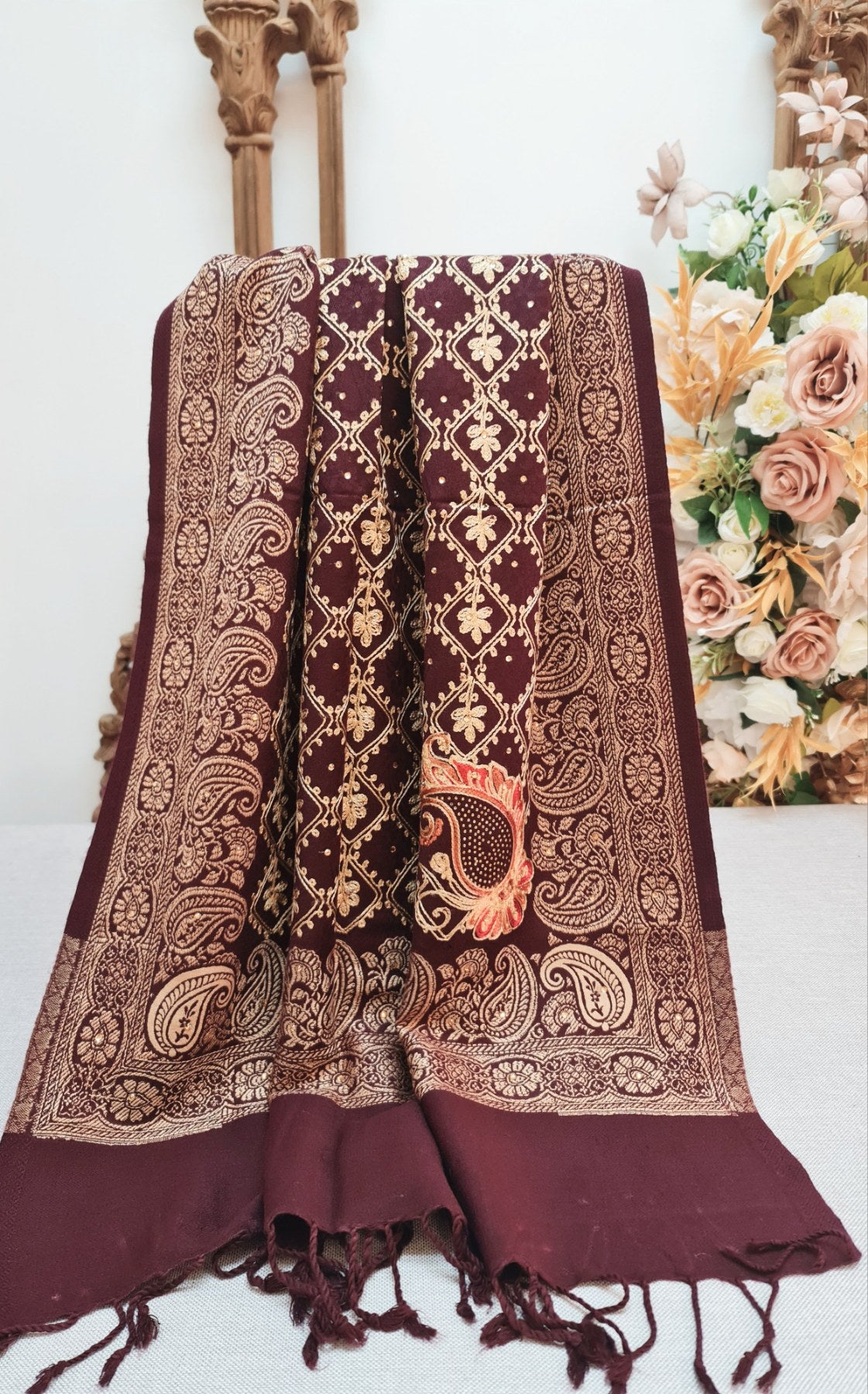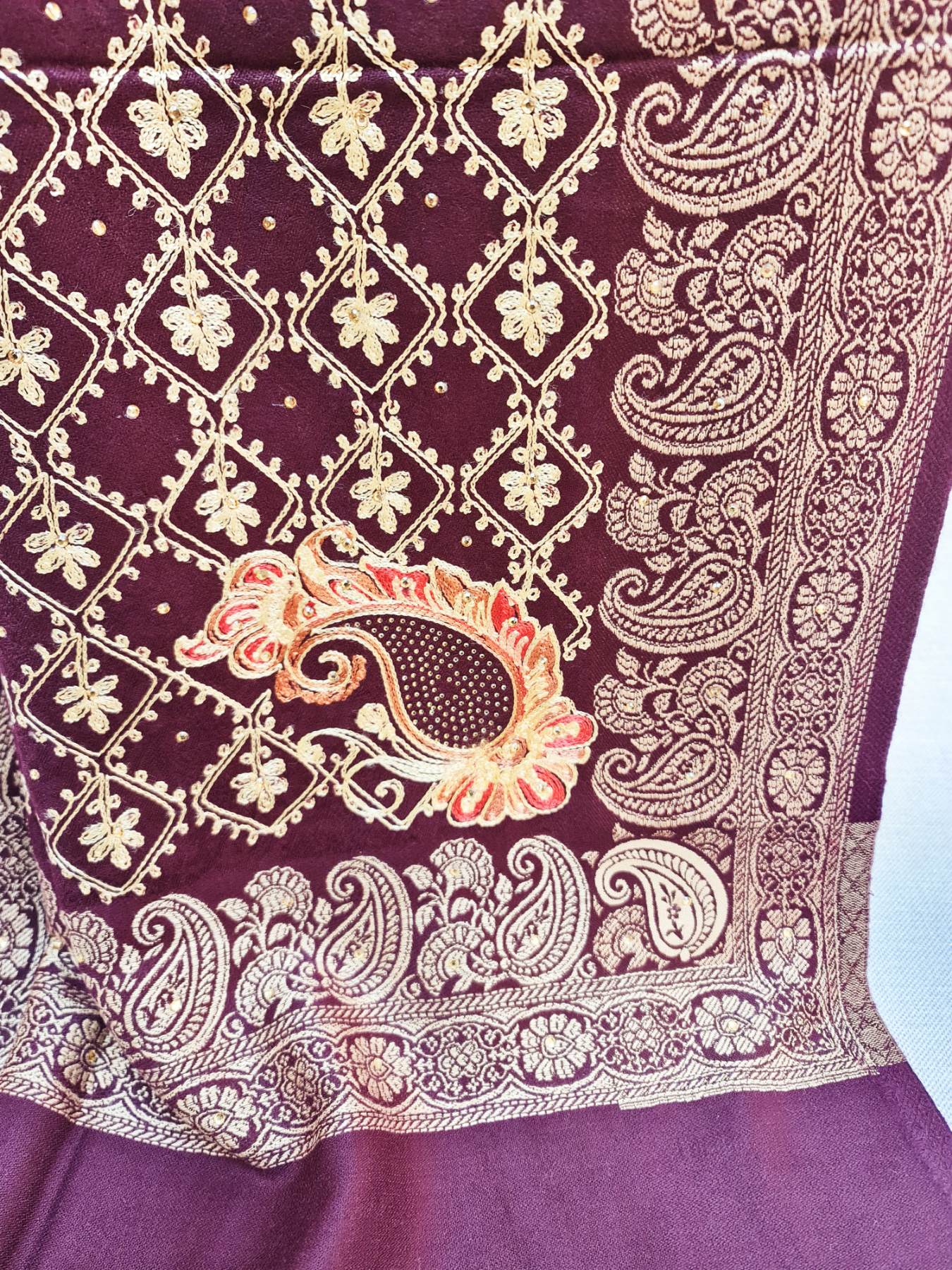 Wine kashmiri shawl with embroidery- wool blend